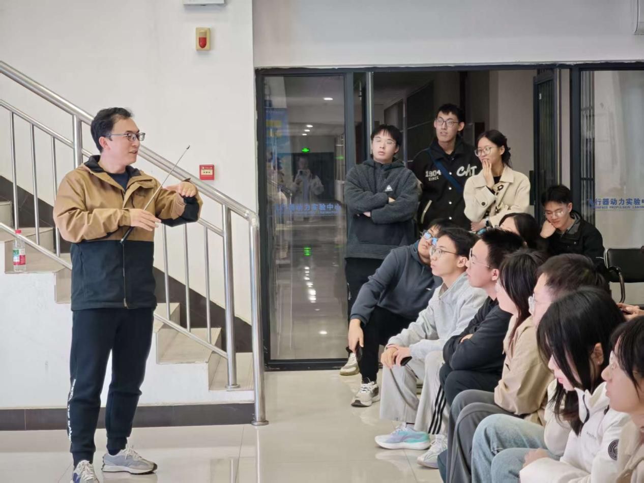 贾老师首先带领同学们参观飞行器动力实验中心,让大家亲身感受航空燃气涡轮发动机运转时的澎湃动力;随后深入讲解发动机核心部件的精妙构造及其高效运转原理,使同学们更深刻地理解了航空动力的科技魅力。