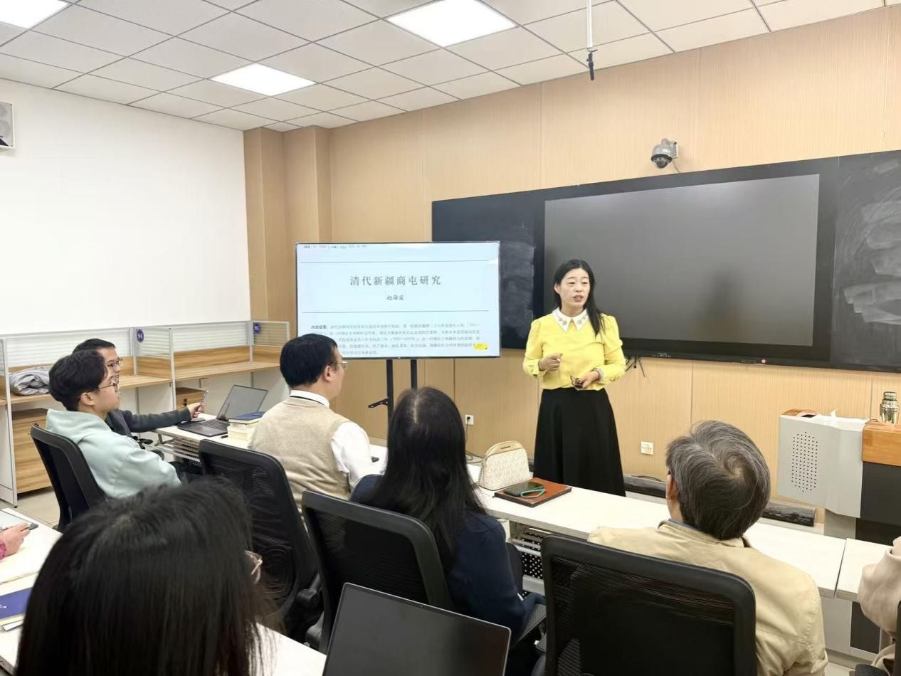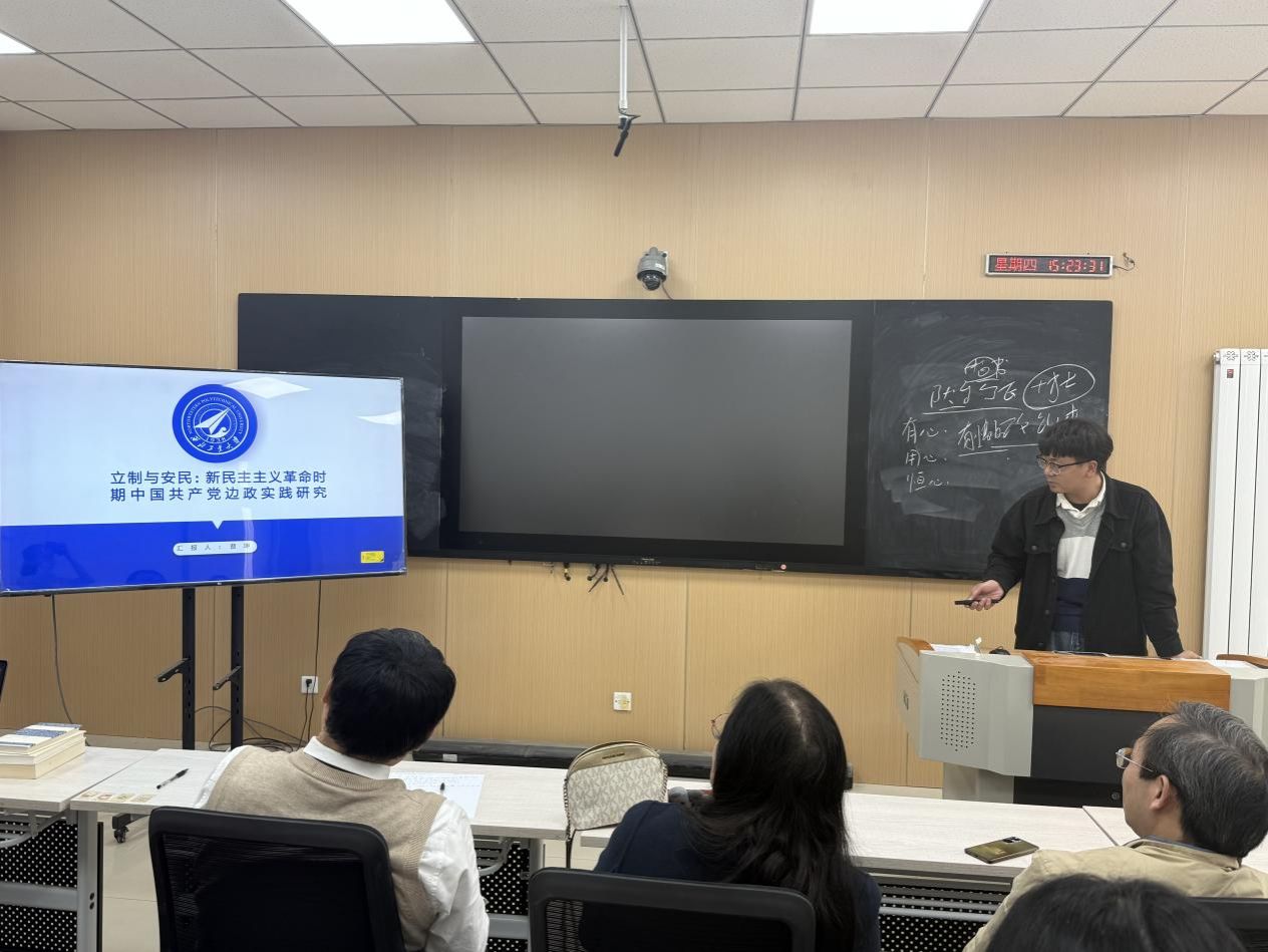 首先,赵海霞教授分享《清代新疆商屯研究》。她深刻剖析清代新疆商屯的发展脉络、经济影响与历史价值,为理解边疆治理和铸牢中华民族共同体意识提供了历史镜鉴。紧接着,马超老师聚焦《全面抗战时期陕甘宁边区党的基层群众工作研究——以乡政府为中心的考察》,深入阐释抗战时期边区党联系群众、服务群众的实践路径,展现了党的群众工作的历史智慧。