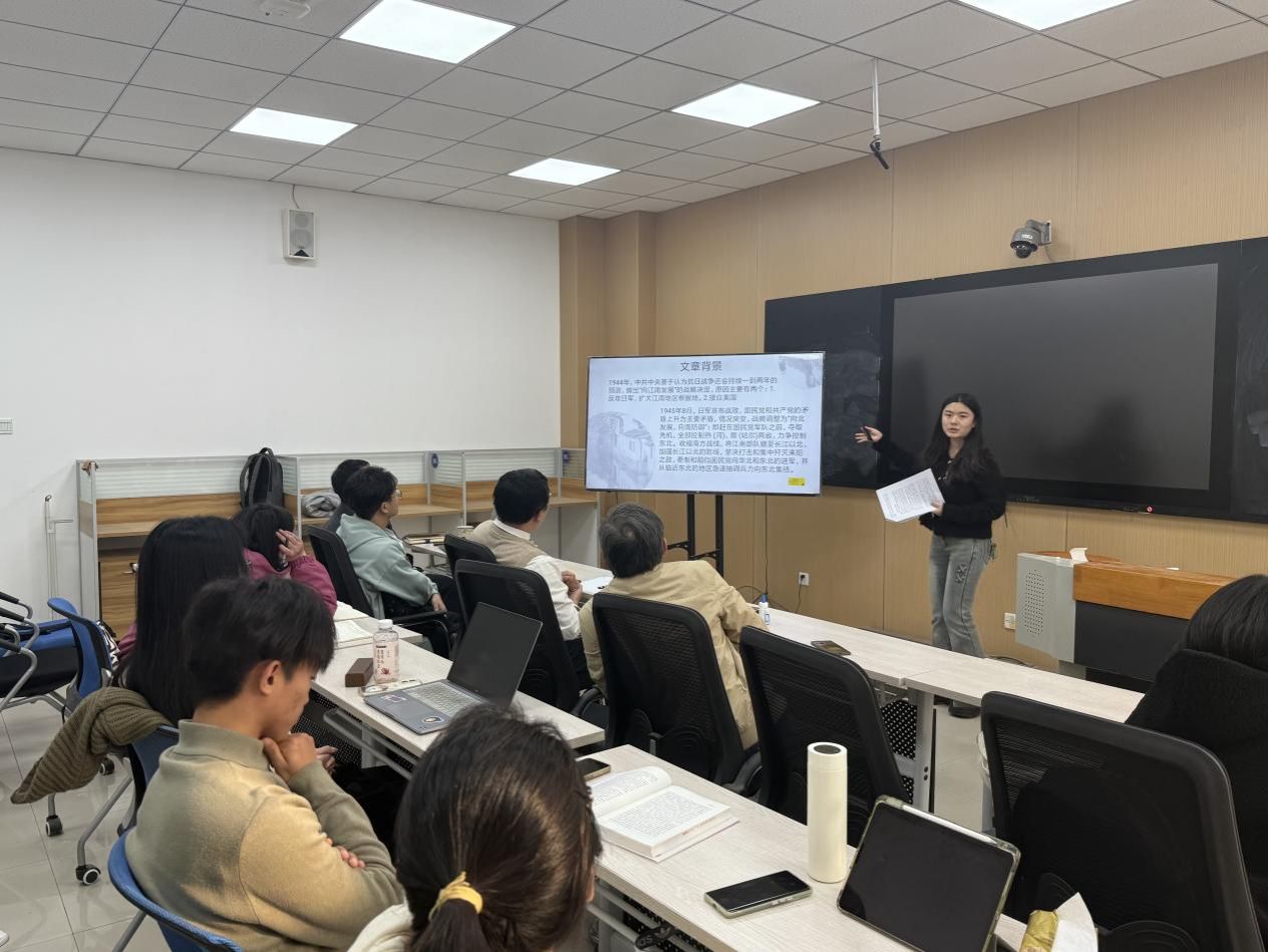 随后,博士生曹坤分享《立制与安民:新民主主义革命时期中国共产党边政实践研究》,梳理了新民主主义革命时期党在边疆地区的治理探索;硕士生孙淑颖以《1945—1947年华中野战军对“向南防御”战略的执行》为题,解析这一战略在淮河战役前的实施细节与历史意义。