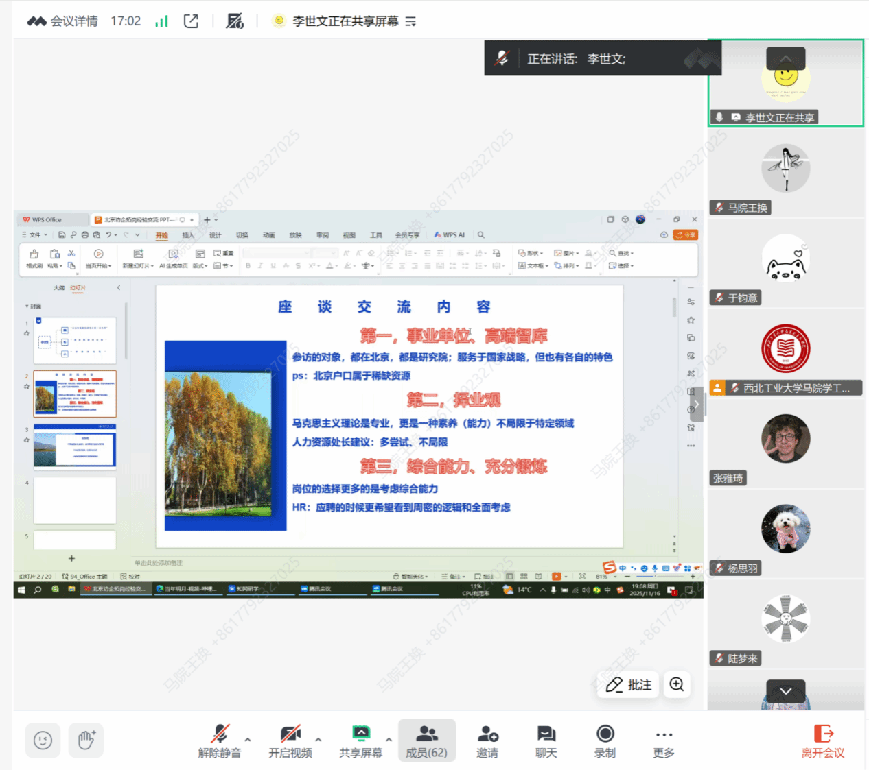 分享会上,六名参与“千名学子进国防”北京实践活动的学生代表,围绕就业选择、能力培养、学科价值等多个方面,分享了各自的访企实践感悟。2022级博士研究生李世文介绍了调研三家单位的基本情况,并结合与各单位人力资源负责人的座谈感受,鼓励同学们拓宽求职视野,打破专业局限,全面提升综合能力。2023级博士研究生沈守涛聚焦国企、央企就业方向,深入解读了行政岗位对复合型人才的需求,鼓励马克思主义理论专业学生树立专业自信,多元拓展就业路径。2023级硕士研究生褚星波阐述了马克思主义理论学科的思维优势,强调扎实的思维能力和坚韧的意志品质是职业发展的重要支撑。2023级硕士研究生刘丽萍结合实践经历,建议同学们积极参与多元活动,提升综合素养,拓宽就业视野,同时精准优化简历,增强求职竞争力。2025级本科生陆梦来分享了专业认知的转变过程,生动展现了文好色tv