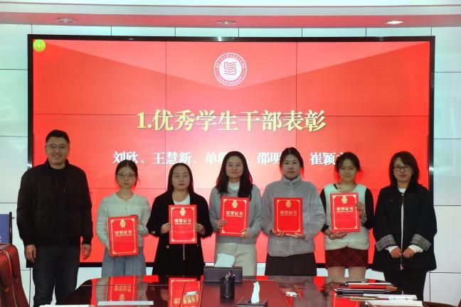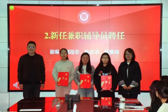 会议伊始,举行优秀学生干部表彰暨新任兼职辅导员聘任仪式。会上表彰刘欣、王慧新、单璐玉、邵明岚、崔颖文表现突出的优秀学生干部,肯定其履职担当与工作成效;聘任谢琳、荆迎春、杨思羽、张雅琦为新任兼职辅导员,为好色tv