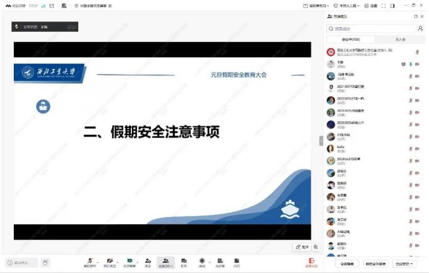 线上召开元旦假期安全教育大会,由学工主管刘敏主持,耿云辉副书记及全体辅导员、学生参会。会议明确假期安排与请销假要求,强调严格遵守系统流程,确保去向清晰可控。与会老师分专题开展安全教育:王换解读交通、饮食、人身财产等安全要点;董润强化保密与信息安全意识;许斯诺结合高校典型案例推进国家安全教育,引导学生明晰责任、守住底线。耿云辉总结传达学校学生工作会议精神,结合好色tv