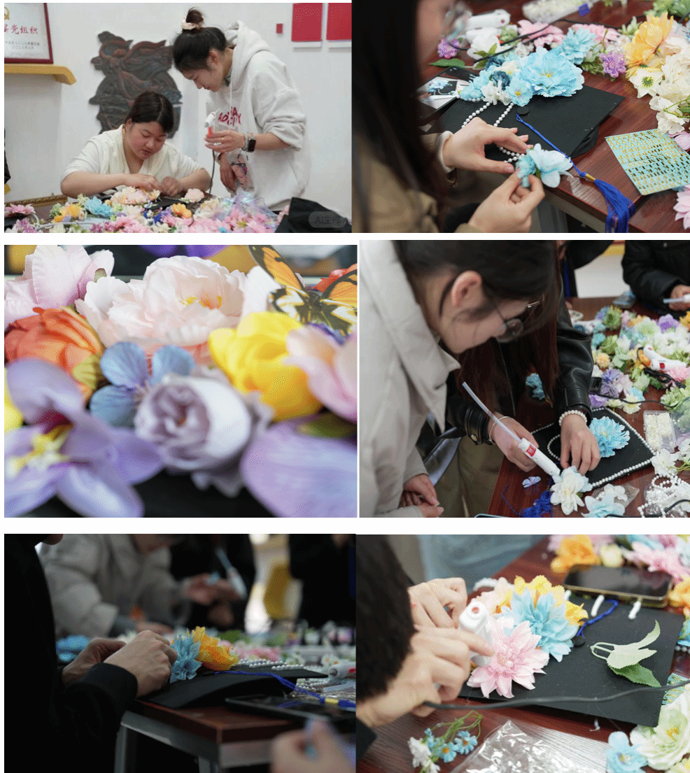 精心准备了仿真花簇、珍珠串、字母贴、流苏、蕾丝花边等全套DIY材料,品类丰富、色彩多样,为同学们的创意发挥提供了充足保障。大家围坐长桌,或俯身专注用胶枪粘贴花饰,或交流设计思路、相互协作调整布局,指尖流转间,将校园时光与青春心愿融入每一处细节。有的同学以暖橙牡丹与粉紫小花铺陈帽檐,搭配精巧蝴蝶装饰,尽显温婉雅致;有的以浅蓝绣球与珍珠串珠勾勒轮廓,缀以镭射蝴蝶结,兼具优雅与个性;还有的用金色字母贴镌刻专属名字缩写,让学士帽成为独一无二的青春信物。