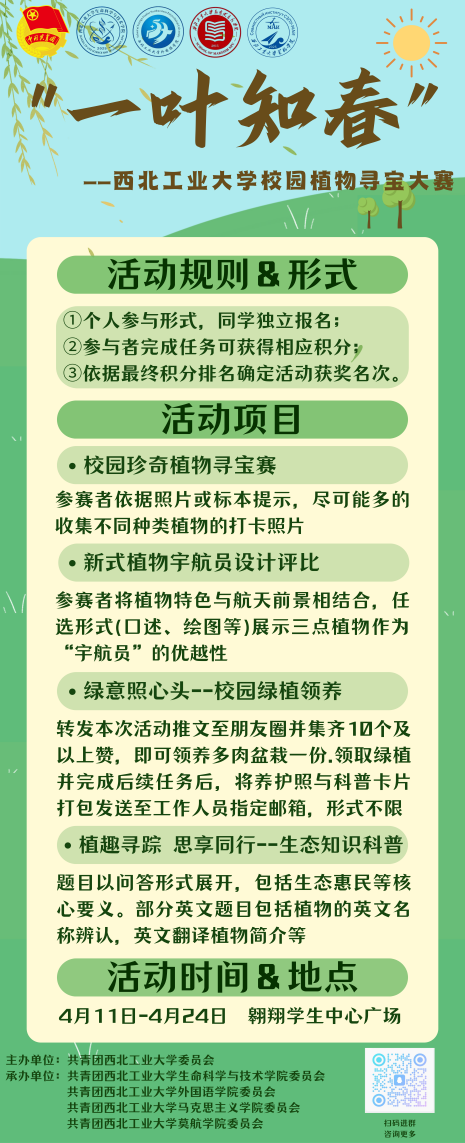 团委联合承办的“一叶知春”校园植物寻宝大赛正式开启,四大趣味玩法,边逛校园边赢积分,更有绿植好礼等你来拿!